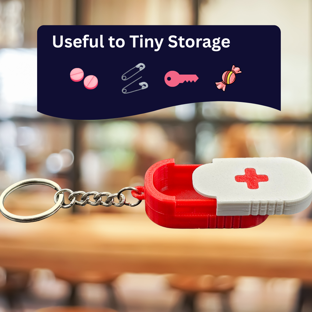 This mini pill box keychain is designed for convenient and secure everyday medicine storage. Compact and lightweight, it functions as a pillbox keyring, medicine dispenser holder, and small storage keychain for tablets and capsules.